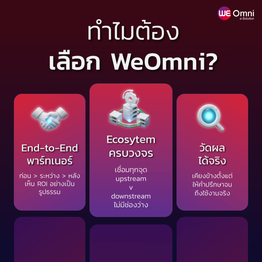 WeOmni คือ Total Commerce Solutions Partner ที่ช่วยองค์กรสร้างและขับเคลื่อน ระบบนิเวศธุรกิจ (ecosystem) แบบครบวงจร ตั้งแต่ขั้นตอนการวางกลยุทธ์, ออกแบบ, พัฒนา ไปจนถึงการติดตามและวัดผลอย่างเป็นระบบ เหนือกว่าการให้บริการเทคโนโลยีทั่วไป ด้วยแนวคิดที่เน้นผลลัพธ์จริงจากการเปลี่ยนผ่านสู่ดิจิทัล
